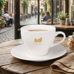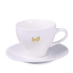 Das Set zeichnet sich durch eine Pantone-farbene Untertasse aus, die als Basis für das klassische weiße Porzellan dient. Dank der präzisen Grafik auf beiden Elementen entsteht eine harmonische und langlebige Komposition mit luxuriösem Charakter. Das spezielle Profil der Untertasse sorgt für Stabilität und unterstreicht die moderne Wirkung des gesamten Sets.