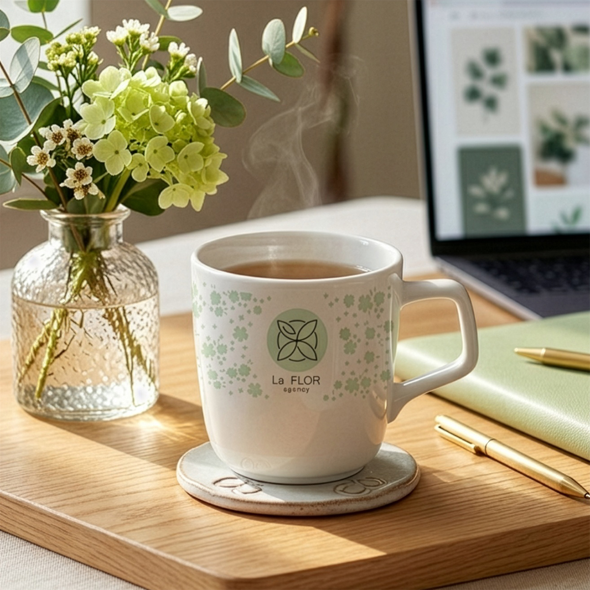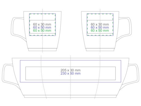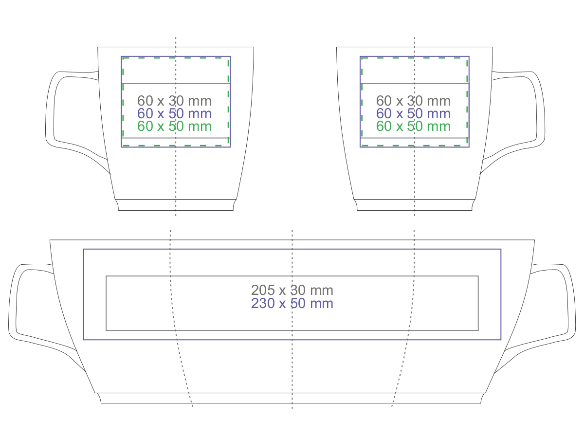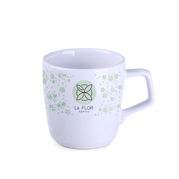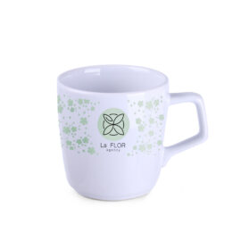 Porzellanbecher mit konvexer Form. Er hat einen originellen, auffälligen Henkel und umfangreiche Möglichkeiten zur Einfärbung.