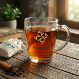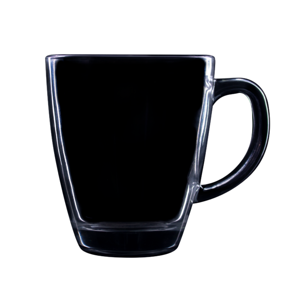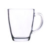 Ein Glasbecher mit konvexer Form und ergonomischem Griff. Er ist aus dickem Glas gefertigt und hat einen stabilen Boden.