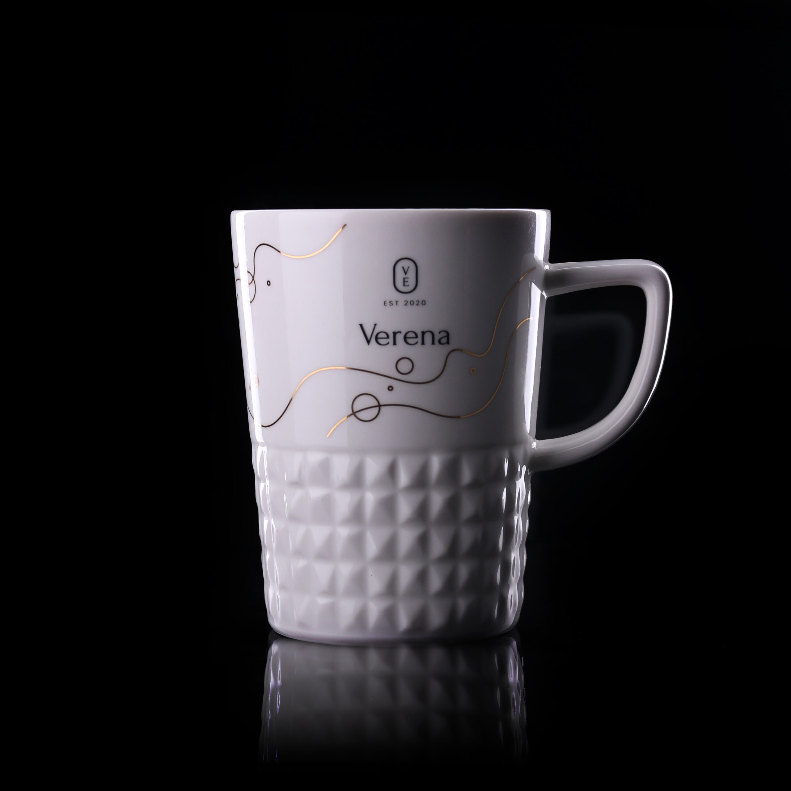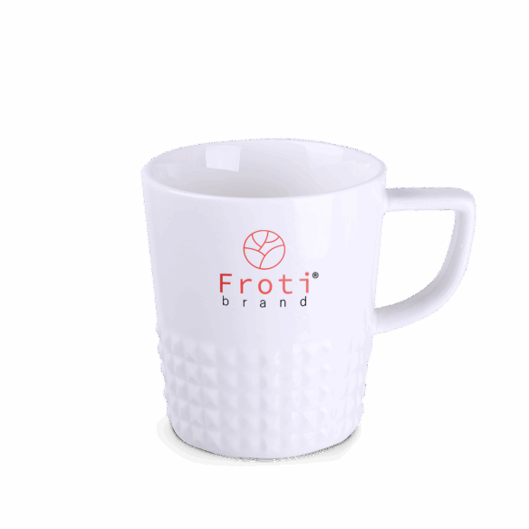 Eleganter Designbecher aus hochwertigem Porzellan. Er hat einen modernen Griff und Vorsprünge, die ihm einen einzigartigen Charakter verleihen. Perfekt für originelle Designs.