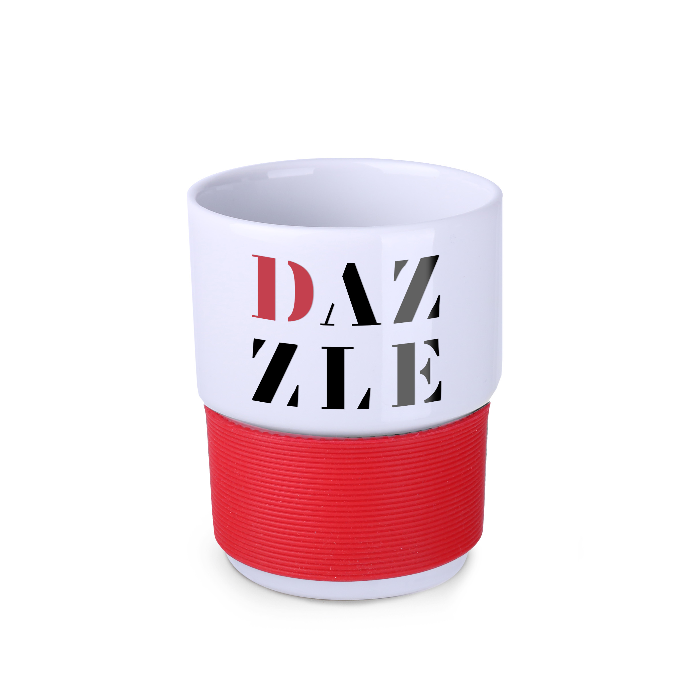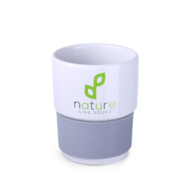Ein Modell im Retrostil mit einfachem Design, hergestellt aus europäischem Porzellan. Seine Form ermöglicht das Stapeln. Der Becher ist mit einem 40 mm dicken Gummiband versehen, das in Farben erhältlich ist und Ihre Hände vor Verbrennungen schützt.