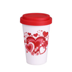 Mittelgroße Werbetasse aus Porzellan ohne Henkel. Stapelbarer Schnitt. Möglichkeit zur Anbringung zusätzlicher Isolierbänder (ein Band 40 mm breit oder 2 Bänder à 20 mm breit). Bänder in 7 Ausführungen erhältlich