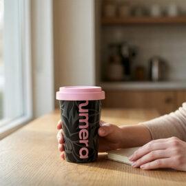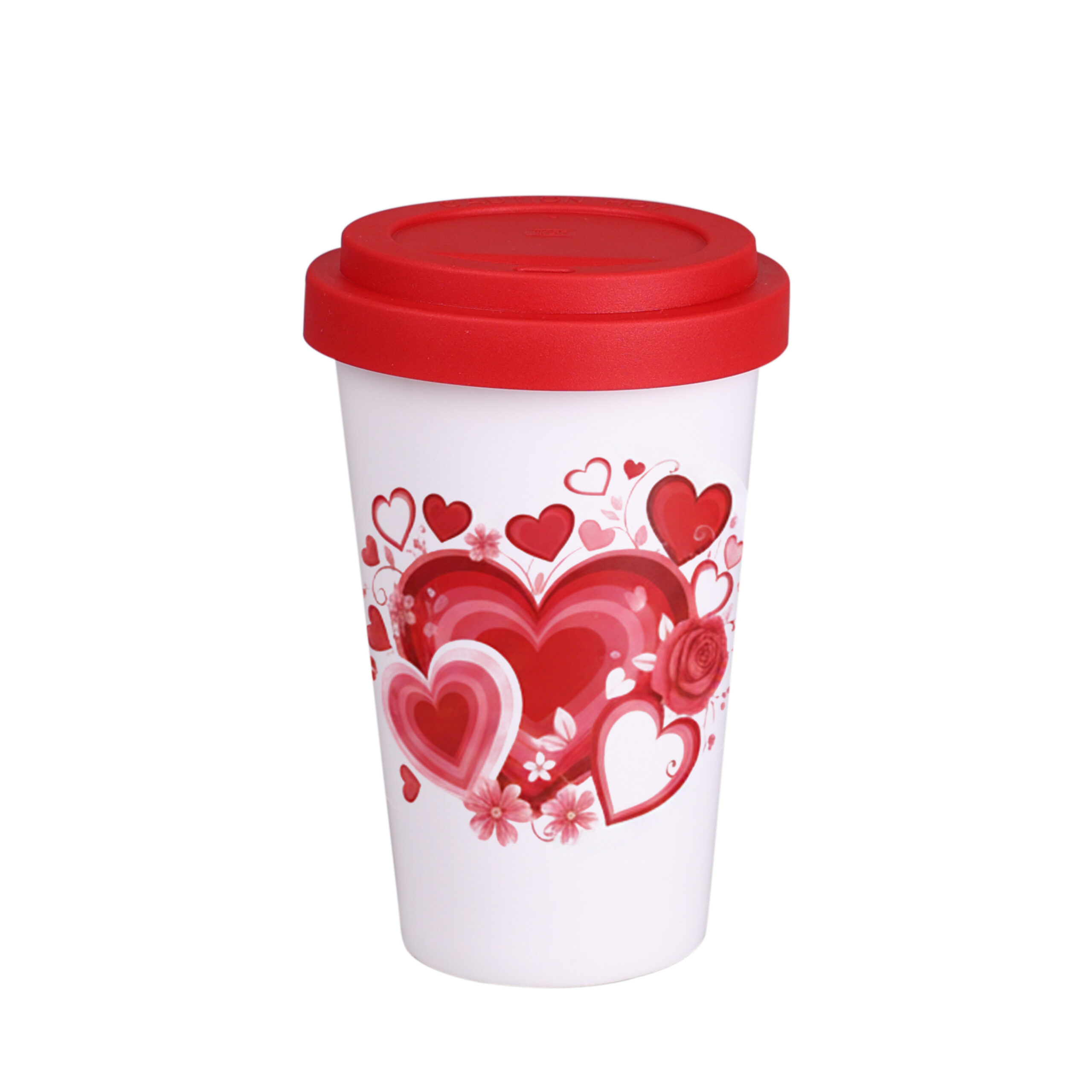 Becher aus Porzellan mit einem Kunststoffdeckel, der vor versehentlichem Verschütten des Getränks schützt. Das Modell ist für aktive Menschen, Liebhaber von Ausflügen und Reisen bestimmt. Dank der seltenen inneren Struktur aus doppelten Porzellanwänden zeichnet sich dieser Becher durch ein erhöhtes Maß an Wärmeisolierung aus. Der Deckel ist in 8 Farben erhältlich: weiß, orange, rot, grün, marineblau, braun, schwarz und grau.