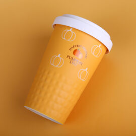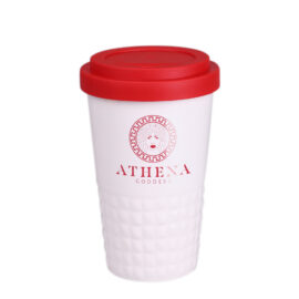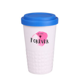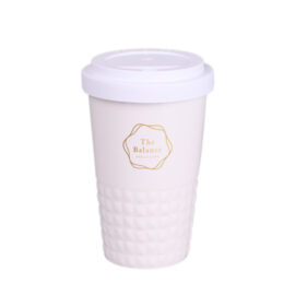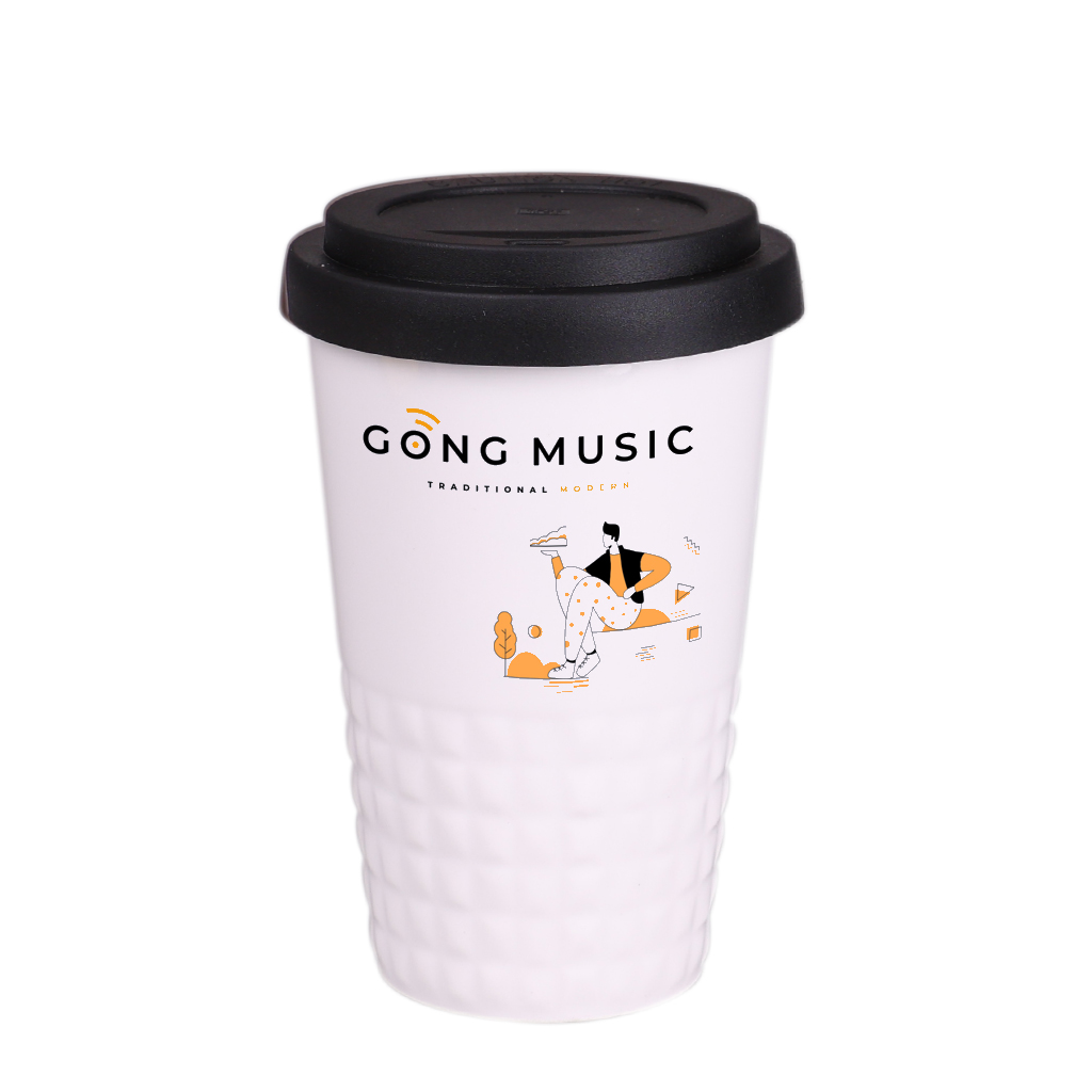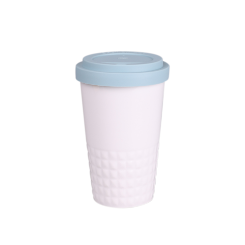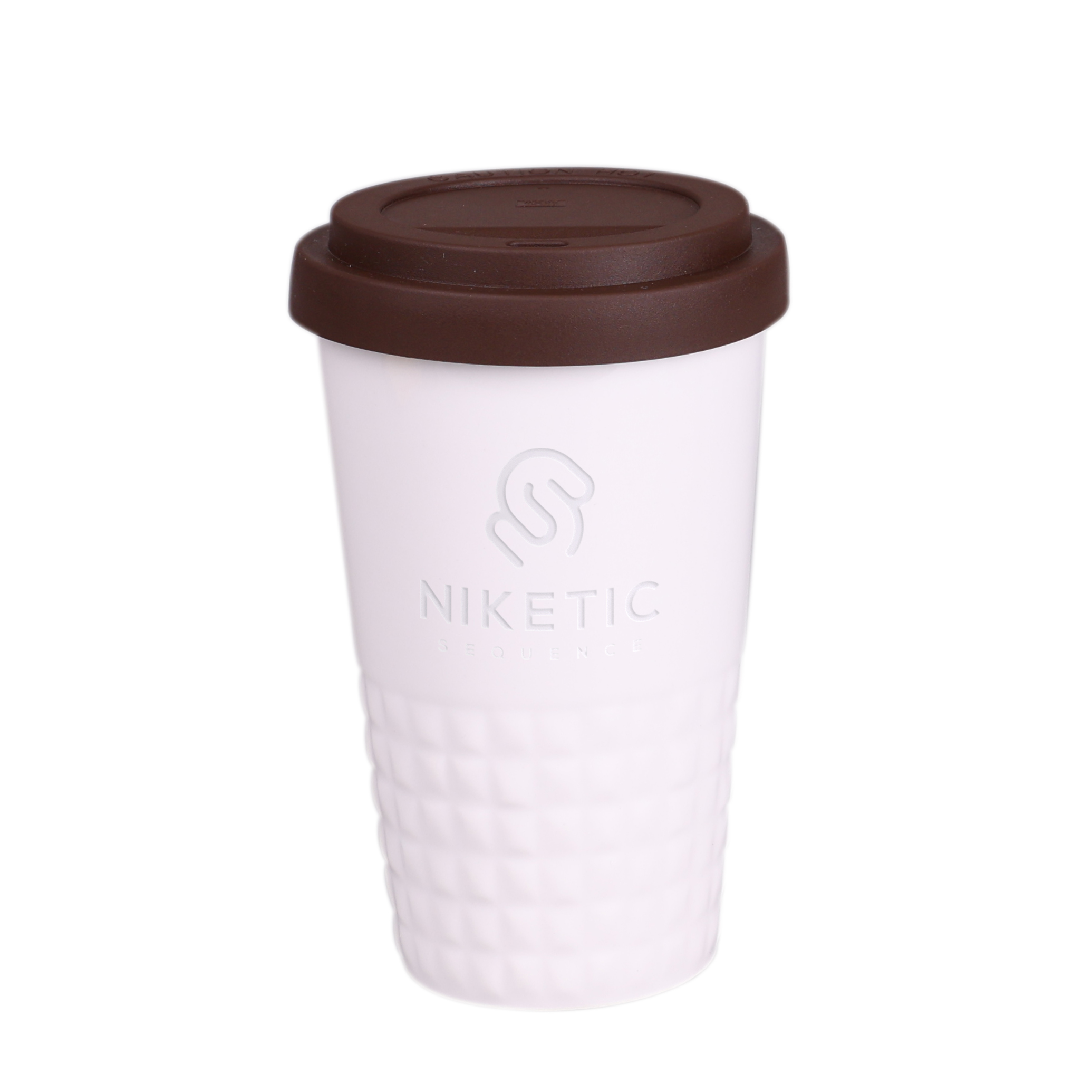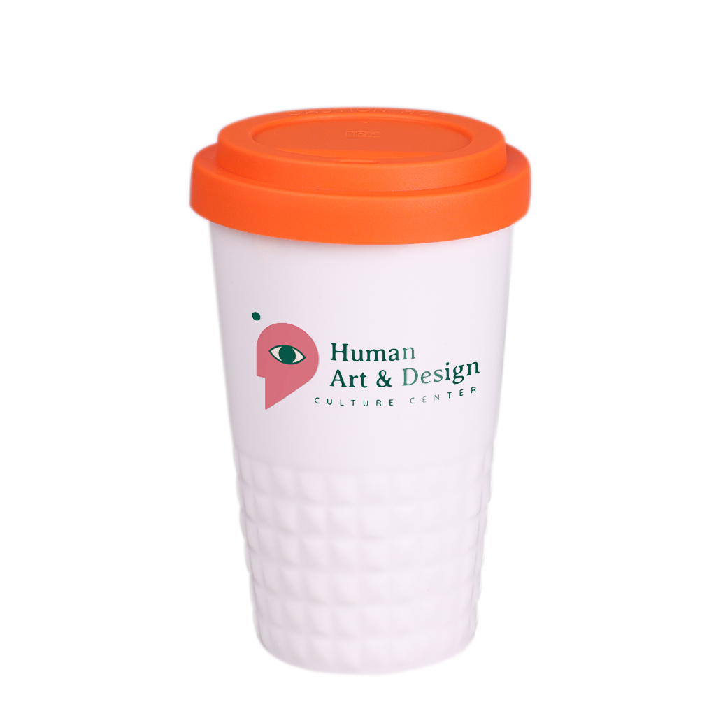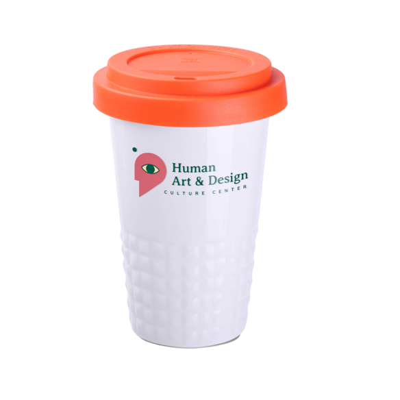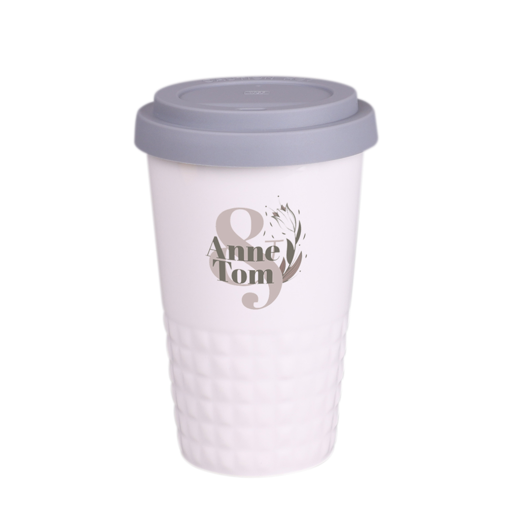 Mobiler Designer-Becher aus Porzellan. Er hat eine charakteristische Ausführung des unteren Teils in Form einer geometrischen Struktur. Das Modell ist für aktive Menschen, Liebhaber von Ausflügen und Reisen bestimmt. Dank der seltenen inneren Struktur aus doppelten Porzellanwänden zeichnet er sich durch eine erhöhte Wärmedämmung aus. Der Deckel ist in Farben erhältlich.