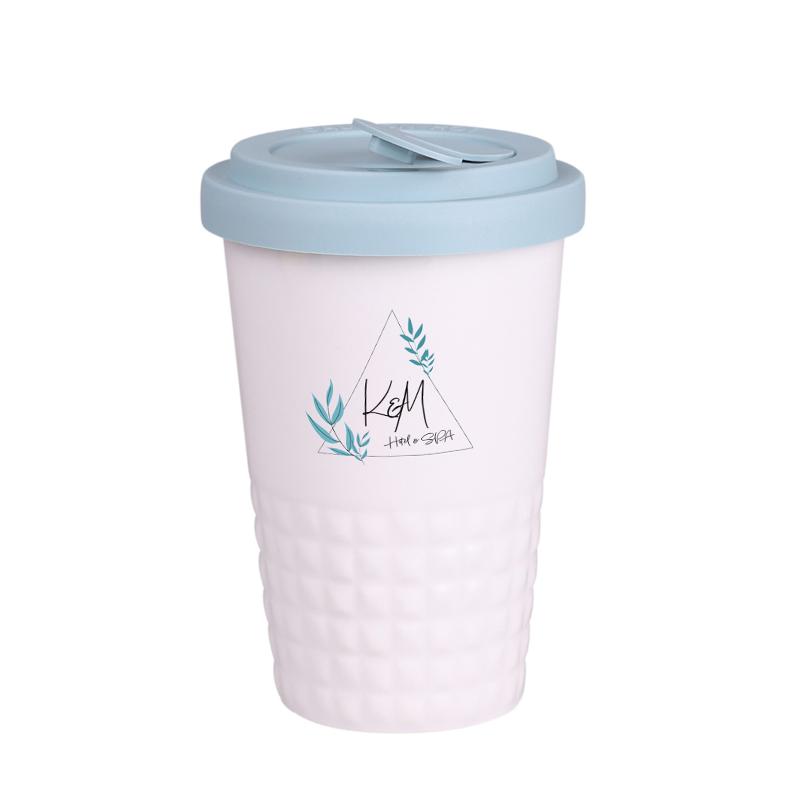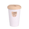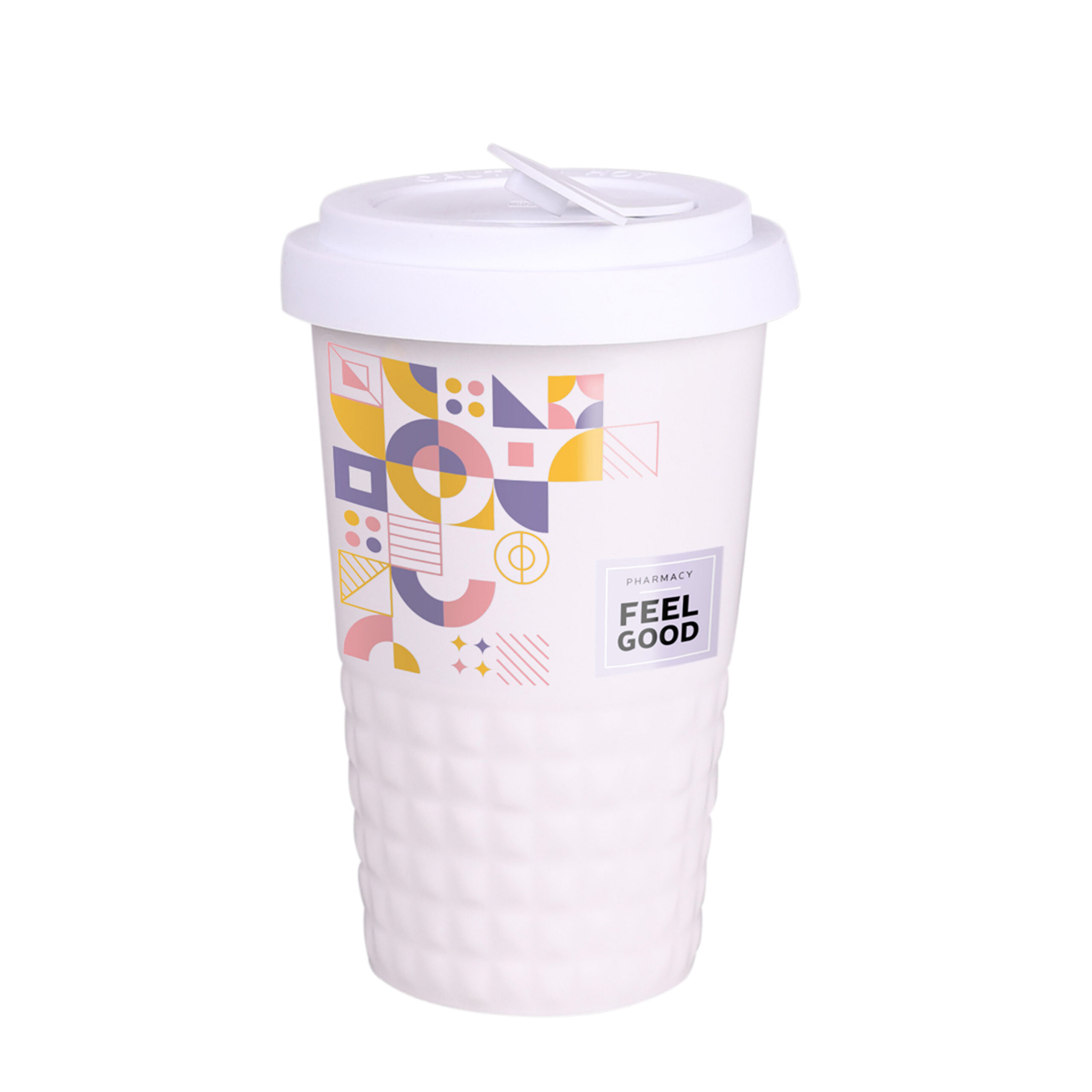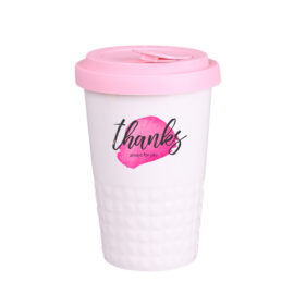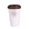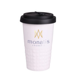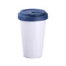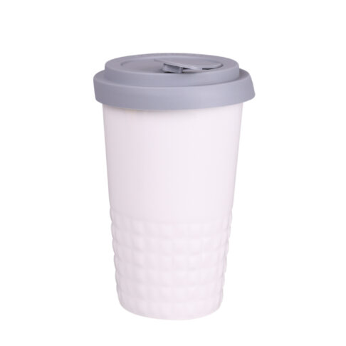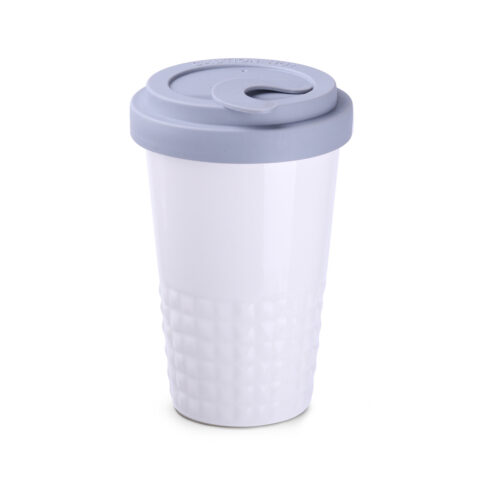 Mobiler Designer-Becher aus Porzellan. Es hat eine charakteristische Oberfläche des unteren Teils in Form einer geometrischen Struktur. Das Modell ist für aktive Menschen, Liebhaber von Ausflügen und Reisen bestimmt. Dank der seltenen inneren Struktur aus doppelten Porzellanwänden zeichnet er sich durch eine erhöhte Wärmeisolierung aus. Er hat einen Deckel mit festem Verschluss, erhältlich in Farben.