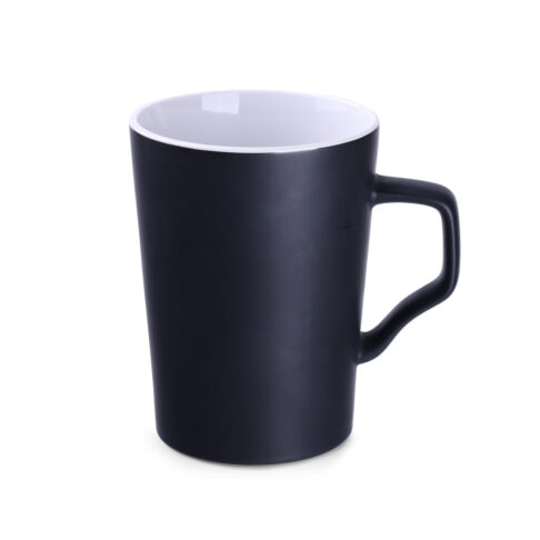 Ein eleganter Becher mit dem luxuriösen Touch der mattschwarzen Supreme-Oberfläche auf der Außenseite. Das Produkt ist in zwei Innenfarben erhältlich: weiß und schwarz. Schlichte, gediegene Wände werden die Werte des Unternehmens perfekt unterstreichen.
