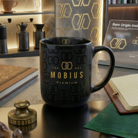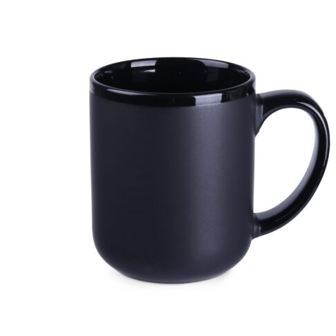 Ein geräumiger Becher mit einer sehr stabilen Form. Er zeichnet sich durch eine elegante matte Oberfläche und einen kontrastierenden glänzenden Rand aus. Erhältlich in zwei Farbvarianten.