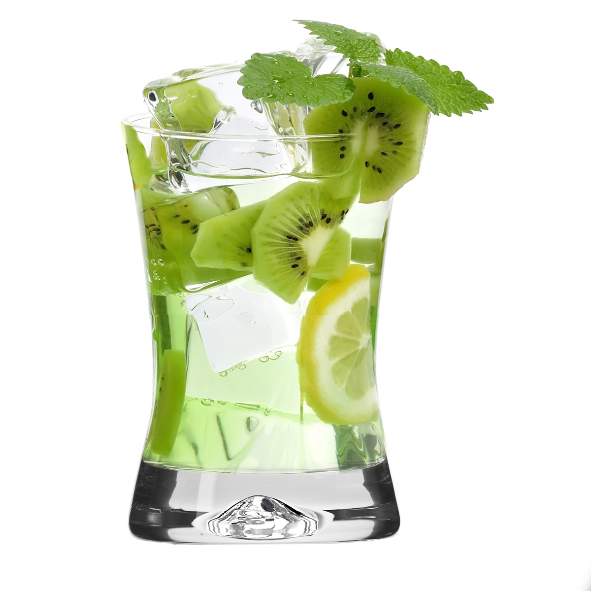 Ein Glas mit einem modernen und originellen Design. Es ist aus dünnem europäischem Glas hergestellt und ähnelt in seiner Form einer Sanduhr. Der dicke Boden verleiht ihm eine außergewöhnliche Stabilität.