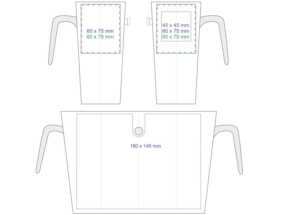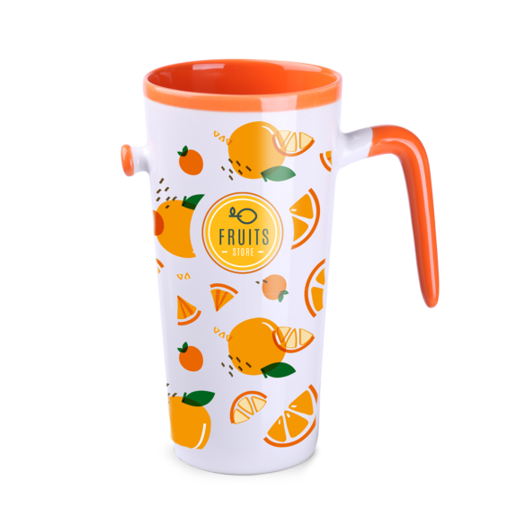 Ein origineller und auffälliger Becher in fünf Innen- und Henkelfarben. Die große Druckfläche bietet reichlich Gelegenheit, die Marke zu bewerben.