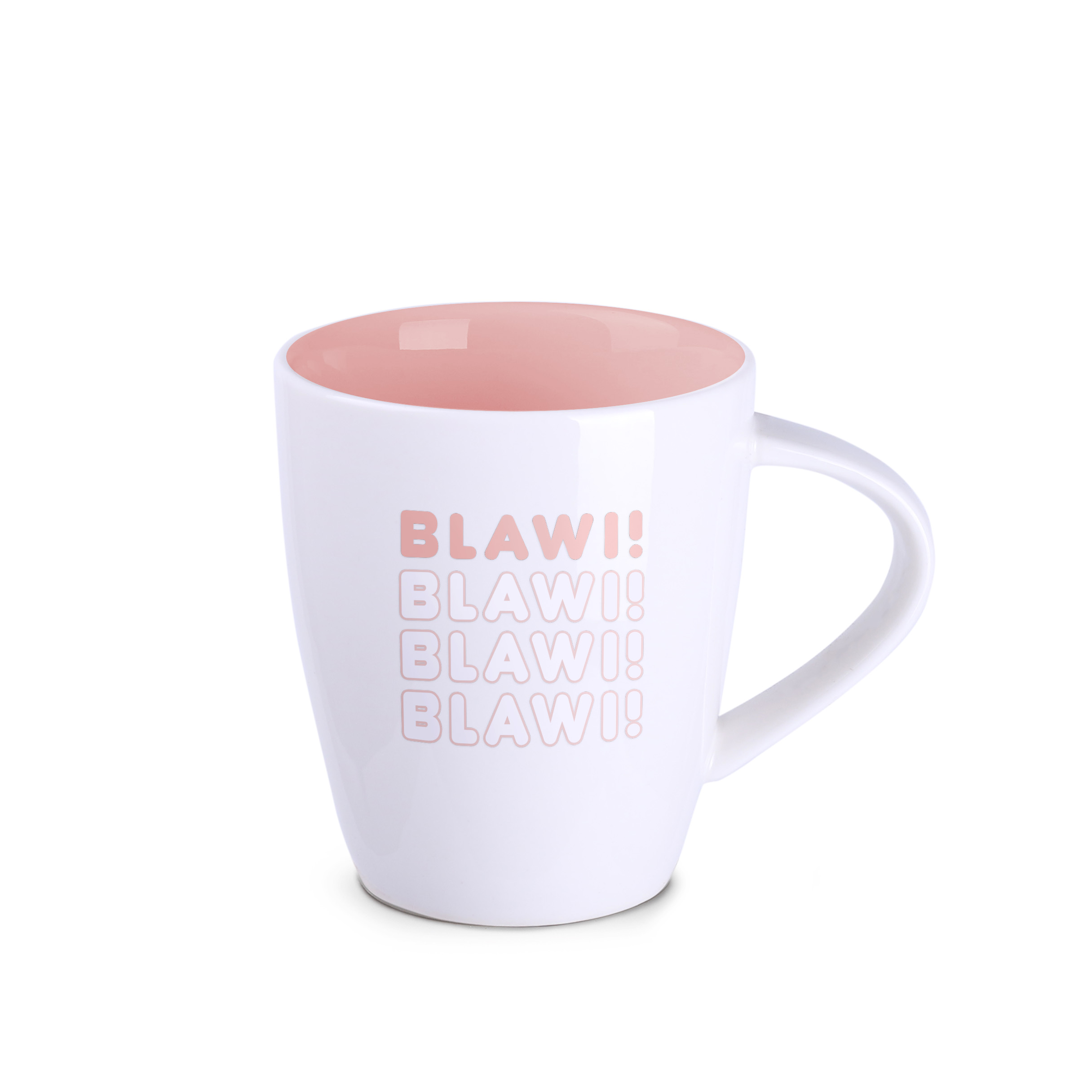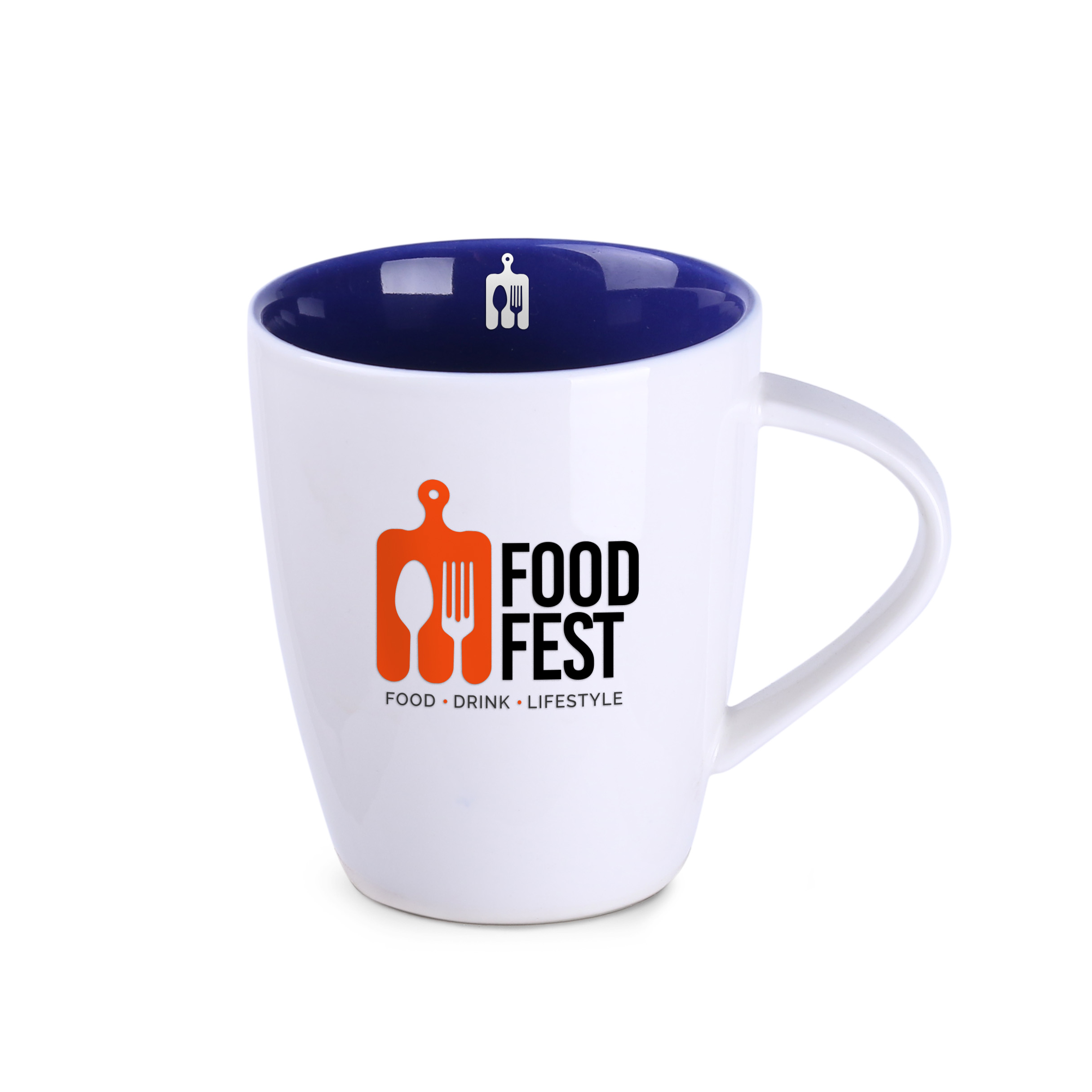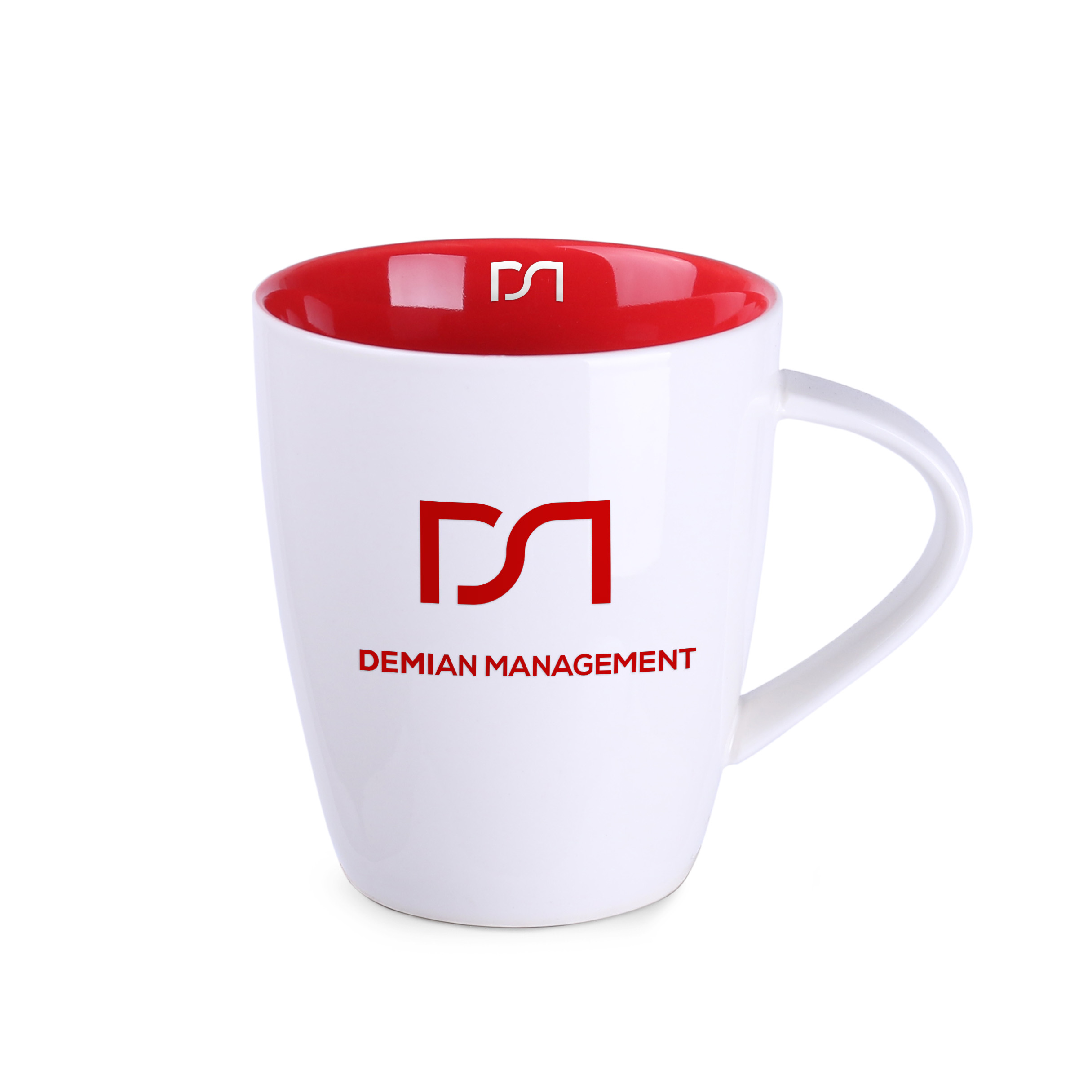 Eine ikonische Tasse aus hochwertigem Royal White-Porzellan. Außen weiß glasiert, innen farbig und mit einem Henkel in Form eines Dreiecks versehen.