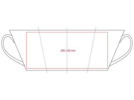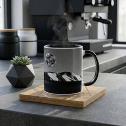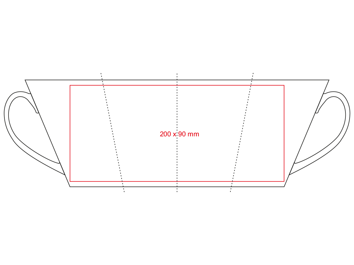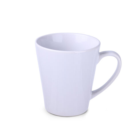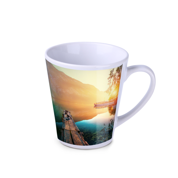 Sublimationbecher mit klassischer Trapezform. Er kann in fotografischer Qualität bedruckt werden. Er hat einen ergonomischen Griff.