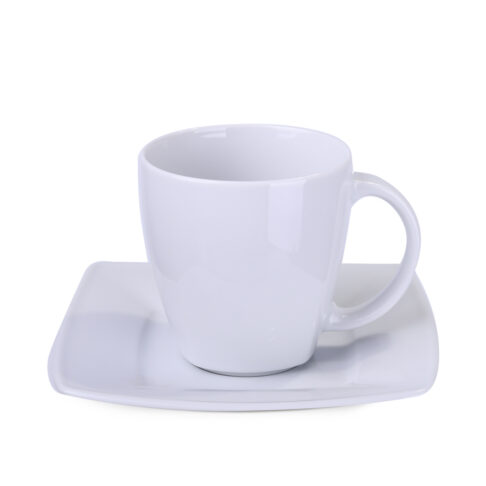 Ein Porzellanset, bestehend aus einer eleganten Tasse und einem passenden Teller. Ein charakteristisches Merkmal dieses Stils sind die zarten quadratischen Abschlüsse, die im unteren Teil sichtbar sind.