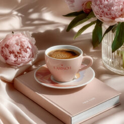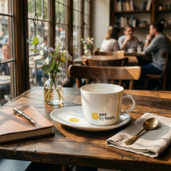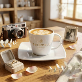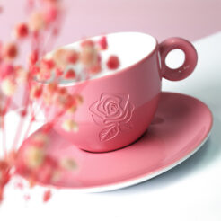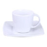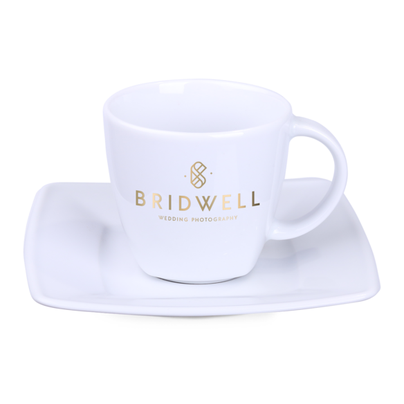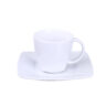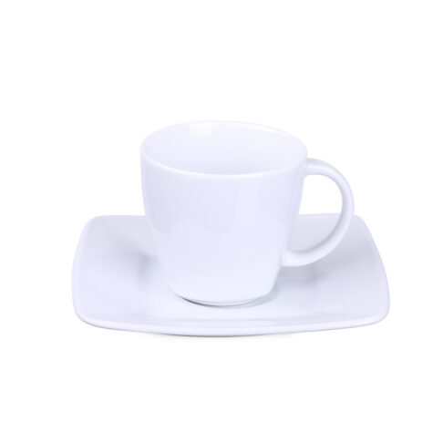 Eine elegante Porzellantasse kombiniert mit einem dazugehörigen Teller. Charakteristisch für dieses Set ist die zarte quadratische Oberfläche, die am unteren Teil der Tasse sichtbar ist.
