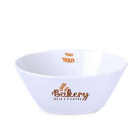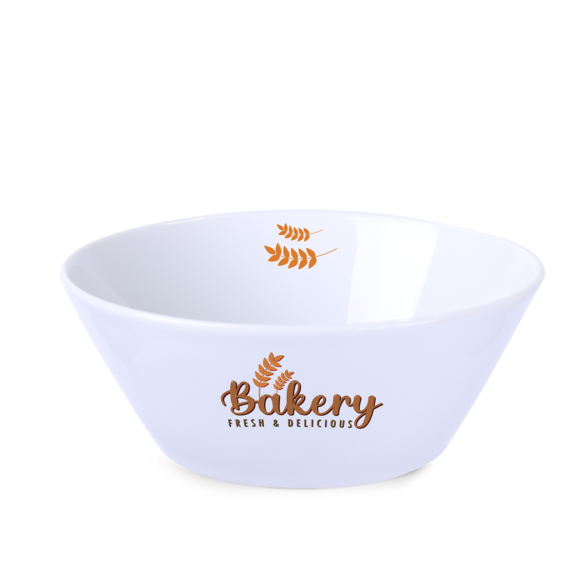 Porzellanschale aus hochwertigem Porzellan. Die konisch geformten Wände, die sich nach oben erweitern, ermöglichen die Anbringung von sehr großen Werbedrucken.