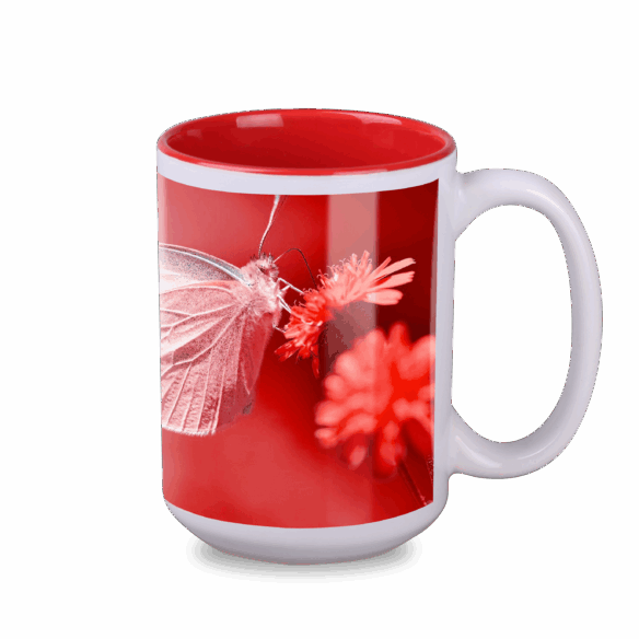 Sublimationsbecher mit klassischer Form und großem Fassungsvermögen. Erhältlich in mehreren Varianten mit farbigem Innenraum. Verfügt über einen ergonomischen Griff und bietet vielfältige Brandingmöglichkeiten.