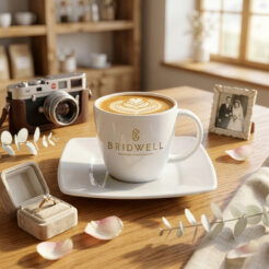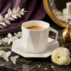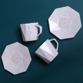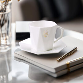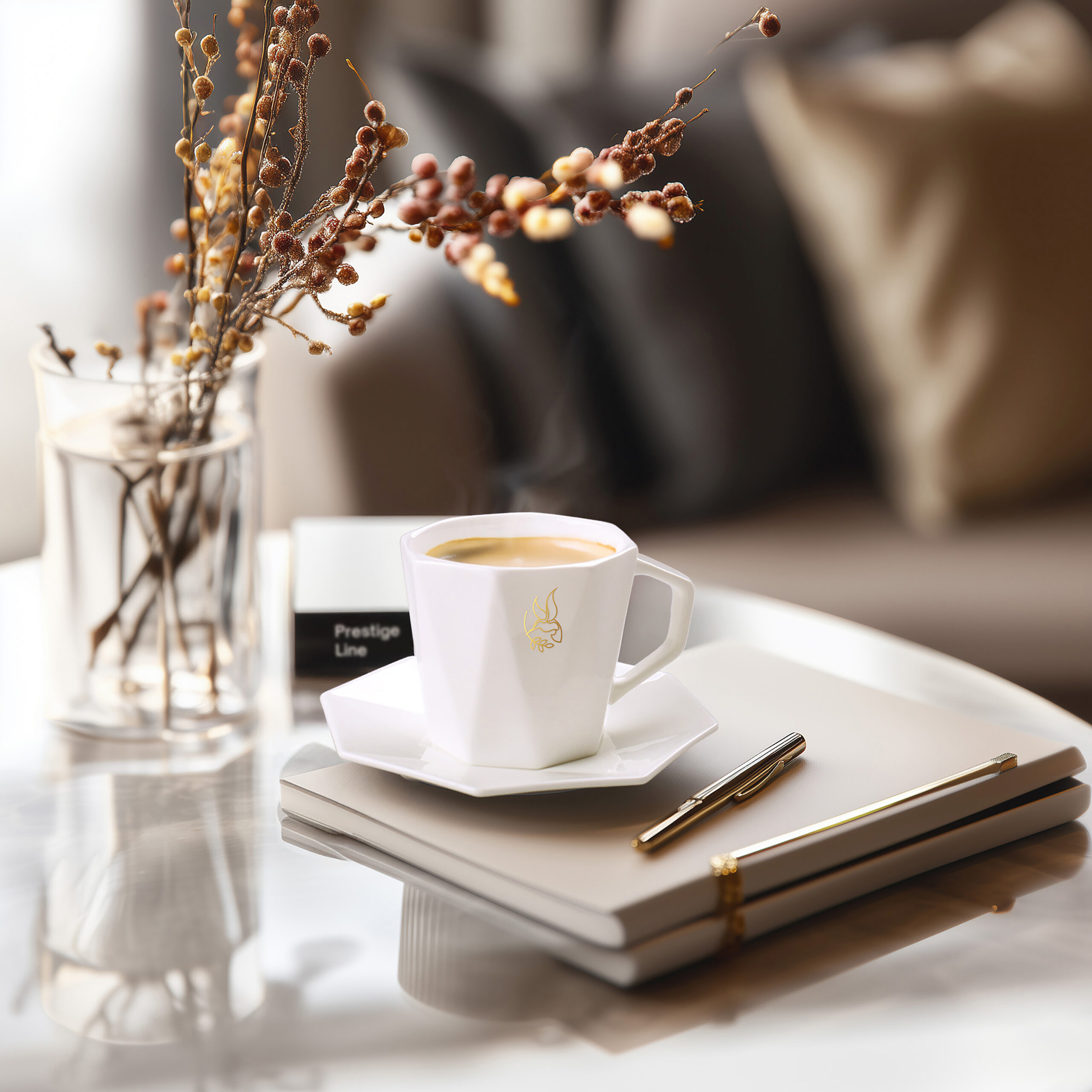 Wunderschöne geometrische Tasse aus hochwertigem Fine Bone China Porzellan. Sie verfügt über eine perfekt passende Untertasse. Gehört zur Prestige Line. Perfekt im Duo mit dem Tiara-Becher.