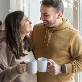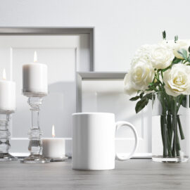 Eine große, einfache zylindrische Tasse. Sein Hauptvorteil ist die große Druckfläche und der gute Preis. Die Tasse ist in vielen Farbvarianten erhältlich.