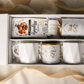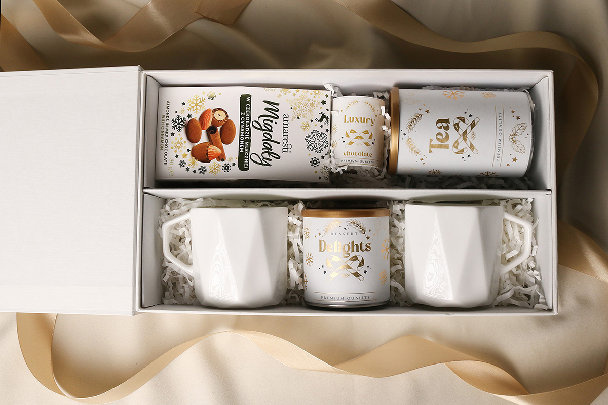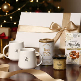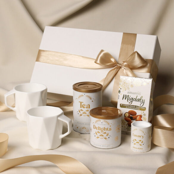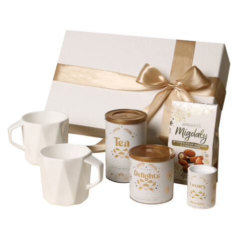 Das Set enthält:Crown weiße Tasse (2 Stück) mit optionaler Verzierung,Sencha Grüntee mit Kirschen und Rosenblättern, verpackt in einer Röhre mit Wintermotiv,Amaresti Pralinen – Mandeln in Schokolade mit Zimt,Dessert Delights – schwarze Johannisbeere in weißer Schokolade,Luxury Chocolate – Belgische Trinkschokolade in einer Röhre mit Wintermotiv,Alles in einer stilvollen, schneeweißen Verpackung mit Magnet.
