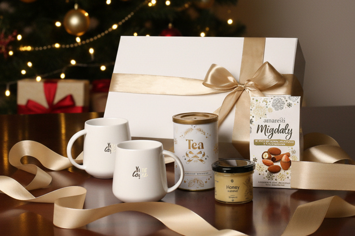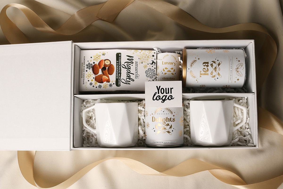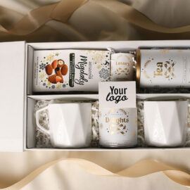 Optionen für zusätzliche Individualisierung:Druck auf den Tassen, Firmenlogo-Anhänger, Band oder Hüllemit Wintermotiv, veredelt mit Goldakzenten.